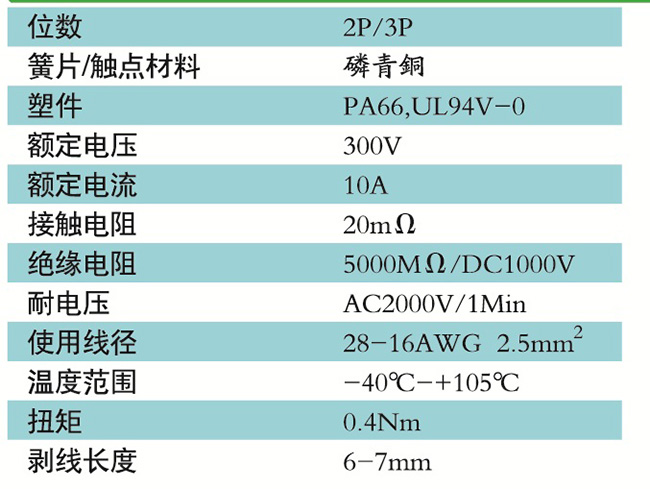 接線端子的絕緣材料用改性的尼龍(PA66),能達到或超過IEC947-7-1EN60947-7-1標準,阻燃等級達到UL94V-0具有良好的電氣性能和機械性能。螺絲用高強度的鋼制成鍍鋅或鎳處理,導電體四方針用合金銅制成表面鍍錫,壓片采用彈性及極強的磷青銅表面鍍錫或鎳;壓線框用抗應力裂縫腐蝕的合金銅制成,這些金屬表面還鍍錫或鍍鎳加以保護。設計完全符合IEC60947-7-1.GB14048.7等標準。