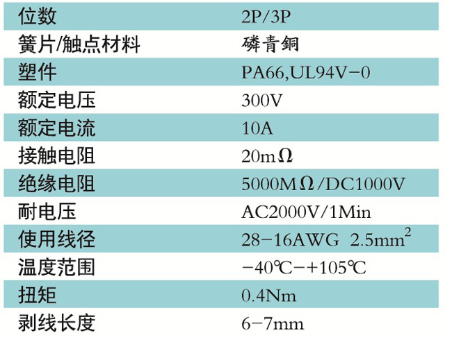 接線端子的絕緣材料用改性的尼龍(PA66),能達到或超過IEC947-7-1EN60947-7-1標準,阻燃等級達到UL94V-0具有良好的電氣性能和機械性能。螺絲用高強度的鋼制成鍍鋅或鎳處理,導電體四方針用合金銅制成表面鍍錫,壓片采用彈性及極強的磷青銅表面鍍錫或鎳;壓線框用抗應力裂縫腐蝕的合金銅制成,這些金屬表面還鍍錫或鍍鎳加以保護。設計完全符合IEC60947-7-1.GB14048.7等標準。